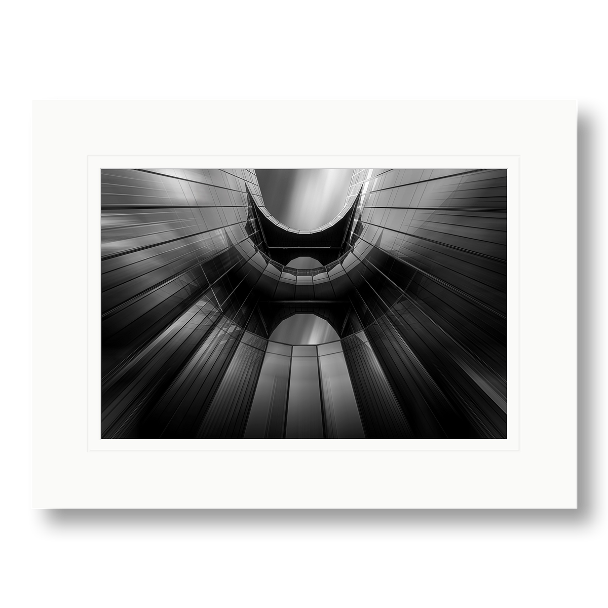 Alatum (ah‑LAH‑toom) is a black‑and‑white fine art architectural abstraction created from a structure in central London. The title is Latin for “winged,” chosen for the dark, emblem‑like silhouette formed at the centre of the composition.