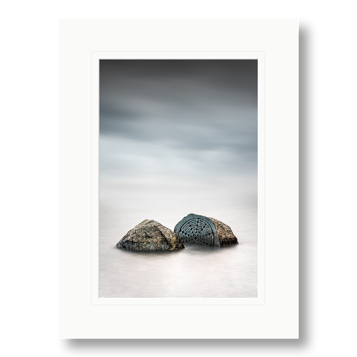 Divisus (dee‑vee‑sus) is a long‑exposure fine‑art study of a sculptural form semi‑submerged in a lake. The work centres on a large stone split into two pieces, its carved interior commemorating 100 years of the National Trust. The extended exposure softens the surrounding water into a mist‑like surface, allowing the divided form to emerge with quiet clarity.