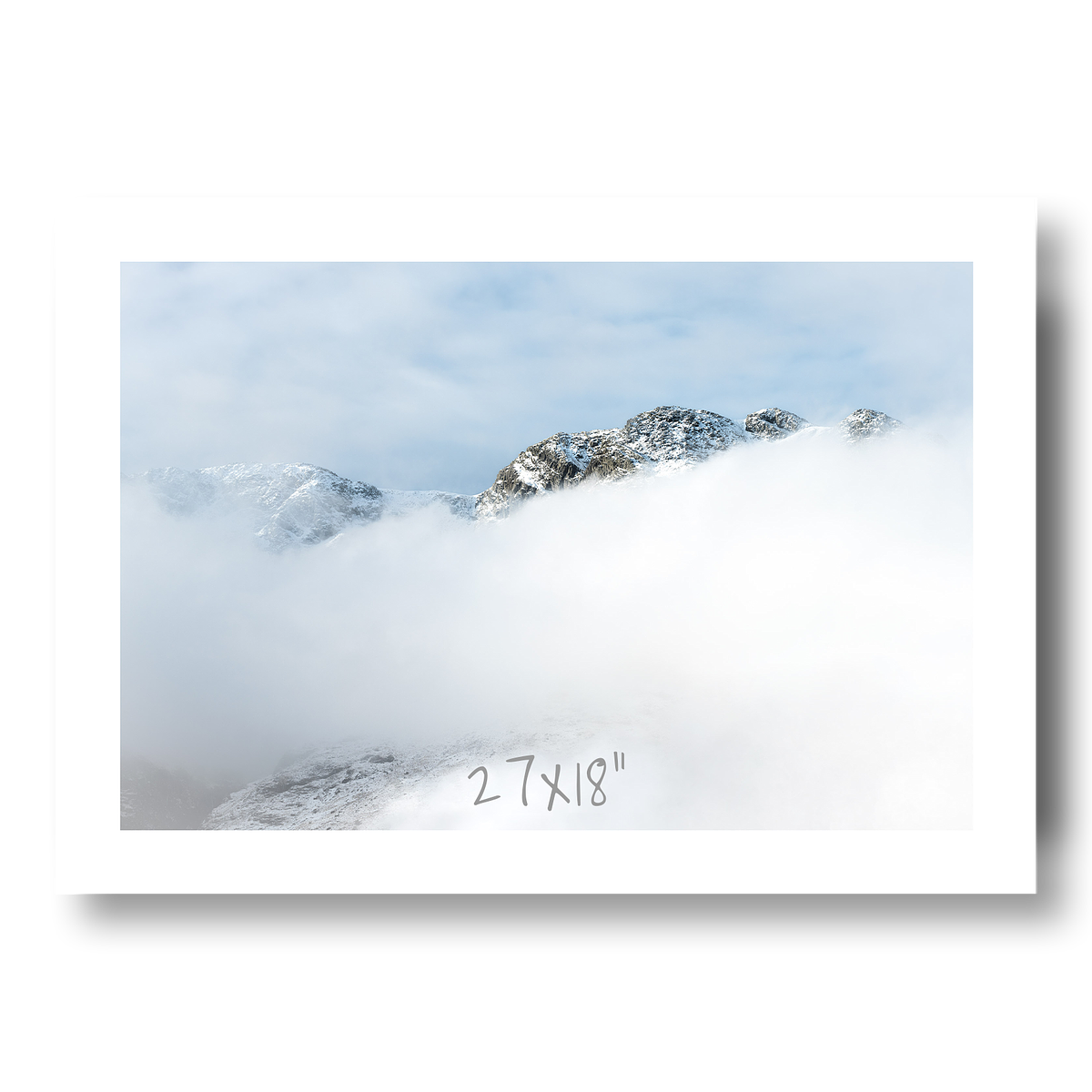 Emergence was captured during the depths of winter in the Lake District National Park, this fine‑art landscape reveals the upper ridge of Crinkle Crags emerging through a shifting veil of cloud. Soft atmospheric light moves across the scene, lifting subtle colour from the snow‑covered rock while the lower slopes disappear into a dense, rising mist.