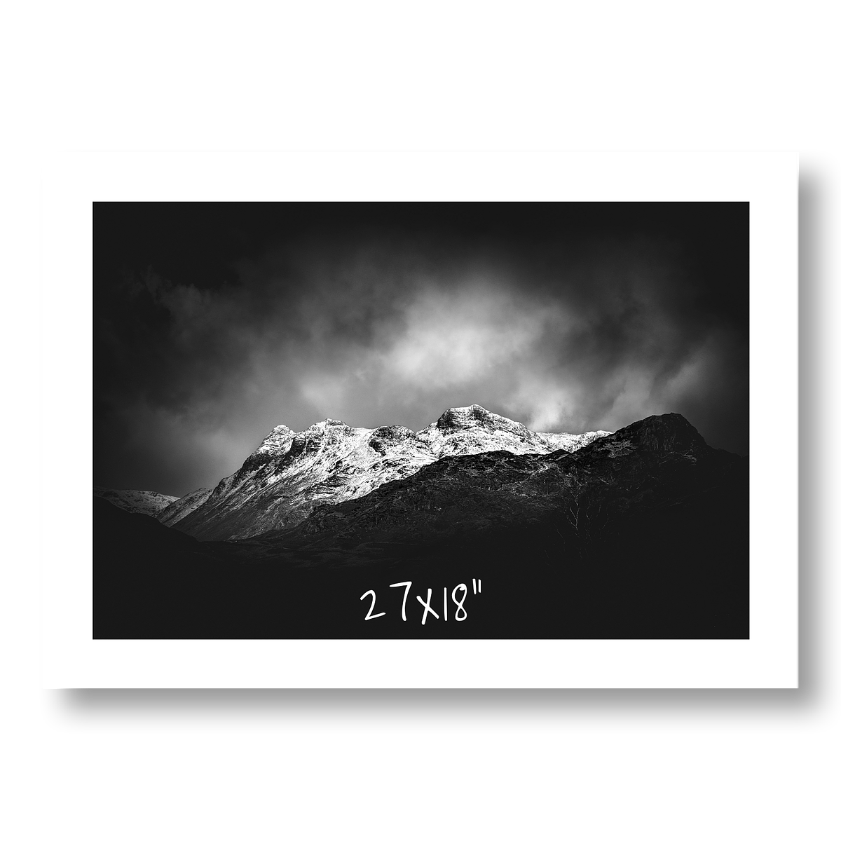 Exposing for the snow covered peaks allowed the foreground fells to fall into deep shadow, reducing the scene to a disciplined interplay of mass and tone. The resulting composition is stripped to its essentials: illuminated atmosphere, darkened land, and the quiet tension between them created other-worldly and almost supernatural contrast