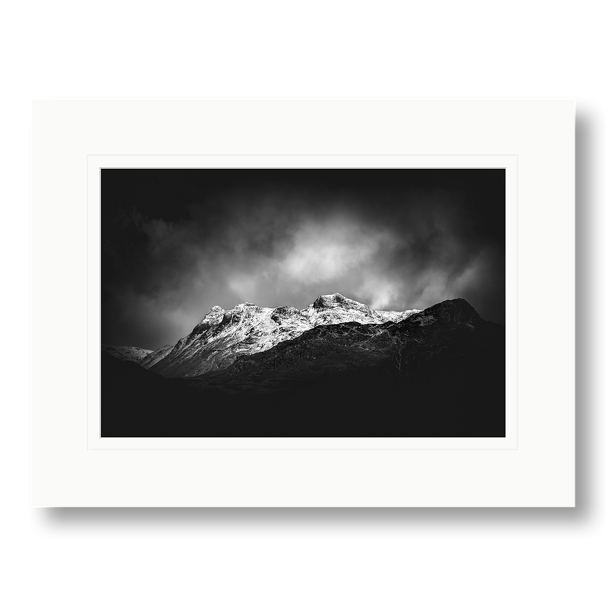 Exposing for the snow covered peaks allowed the foreground fells to fall into deep shadow, reducing the scene to a disciplined interplay of mass and tone. The resulting composition is stripped to its essentials: illuminated atmosphere, darkened land, and the quiet tension between them created other-worldly and almost supernatural contrast .