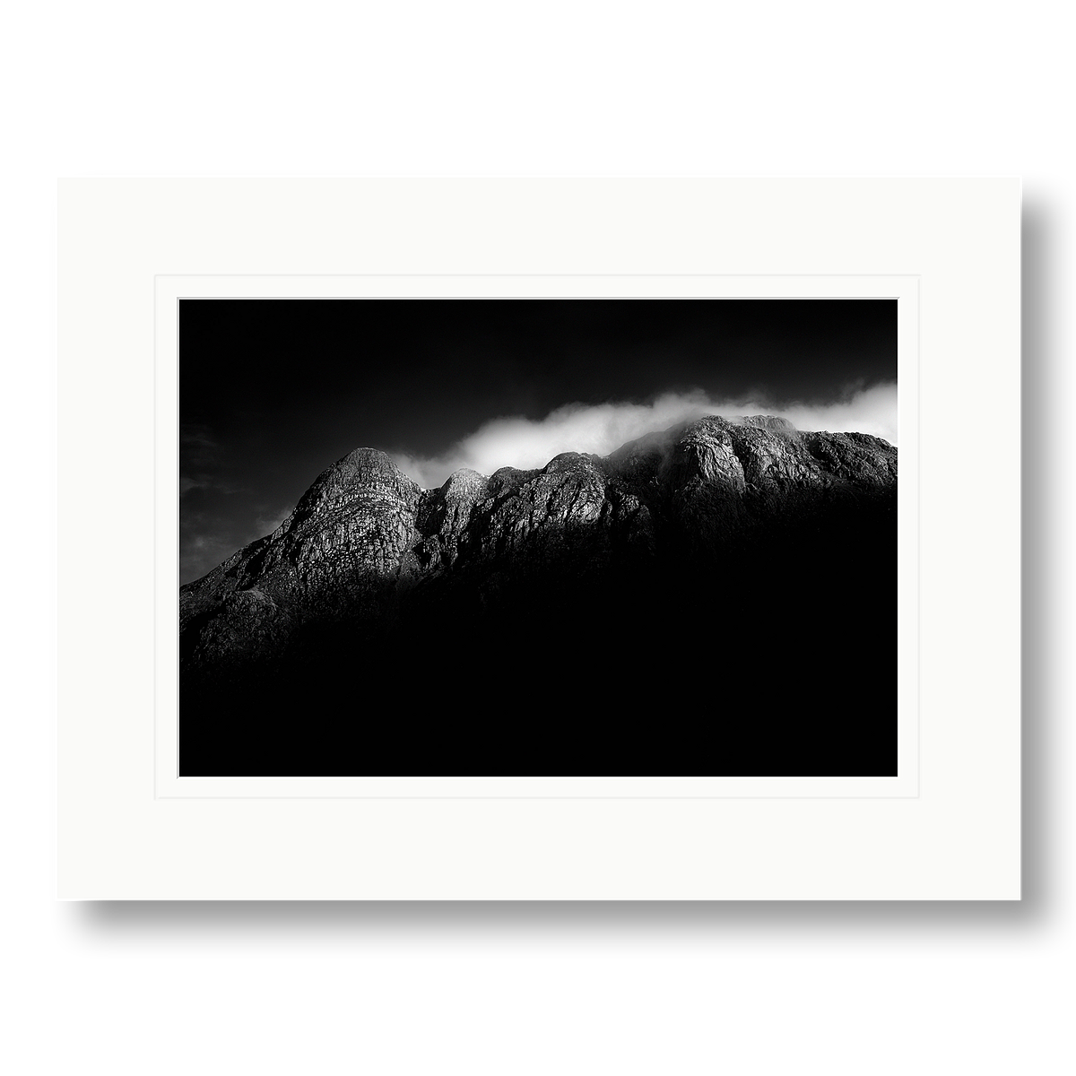 Revelatus (pronounced reh‑veh‑LAH‑toos) is a dramatic, high‑contrast chiaroscuro study of a mountain ridge illuminated by low‑angled directional light. The sun’s shallow trajectory carves the upper faces into sculptural planes while the opposing fells cast deep shadow across the lower slopes. A thin band of cloud drifts along the crest, softening the transition between light and darkness and heightening the image’s atmospheric depth. The result is a portrait of monumental form emerging quietly from shadow — a moment of illumination revealed.